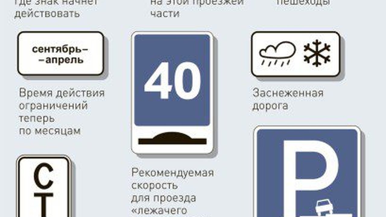 Знак «Время действия» теперь сможет информировать не только о часах и днях, но и о месяцах. Появятся и рекомендации для водителей при проезде неровностей — знак «Рекомендуемая скорость проезда лежачих полицейских». Парковку упростят с помощью комбинированного знака, который будет сразу показывать и разрешенную стоянку, и дополнительные условия, например, тип транспорта или способ его размещения.