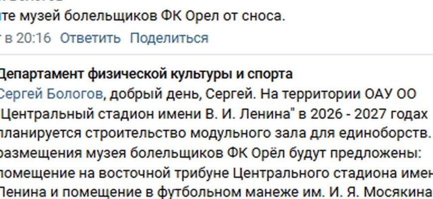 «Для размещения музея болельщиков ФК «Орёл» будут предложены: помещение на восточной трибуне Центрального стадиона имени В. И. Ленина и помещение в футбольном манеже им. И. Я. Мосякина», — сообщили в департаменте.