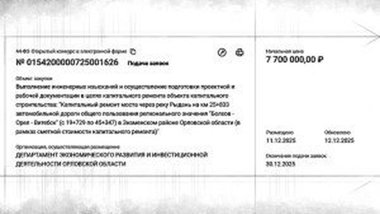 Власти Орловской области приступили к поиску подрядчика для проектирования капитального ремонта моста. Это первый практический шаг, подтверждающий, что работы включены в планы регионального заказчика.
